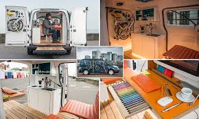 It is ultimate workplace for the modern-day businessman on the move. This mobile office comes with a desk, oak flooring, touchscreen computer and coffee machine - all inside an electric van. The van, created by Nissan and designers Studio Hardie, hopes to help self-employed workers and small businesses save money on rent - although the car company refused to disclose how much the mobile offices would cost. The Nissan e-NV200 (pictured) has been designed as an alternative to the expensive offices The mobile workplace includes a fold out desk, computer and wireless mouse The van includes two leather desk chairs, as well as a mini fridge and coffee machine The electric 'e-NV200 WORKSPACe' features an inbuilt fold-out desk, wireless internet, smartphone-controlled LED lights and mini fridge. It also has two leather desk chairs, one of which can be moved to allow an entrepreneur to sit in front of the computer. Between the chairs, which could be used told hold a meeting, is a wireless charging dock for smartphones, Bluetooth music speaker and a drawer-based mini-fridge.
